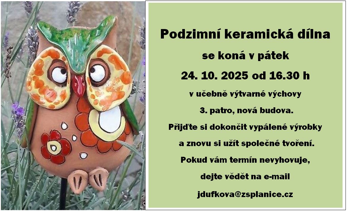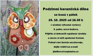 Zveme všechny tvořivé nadšence na podzimní keramickou dílnu, která se uskuteční 24. října od 16:30 ve škole.