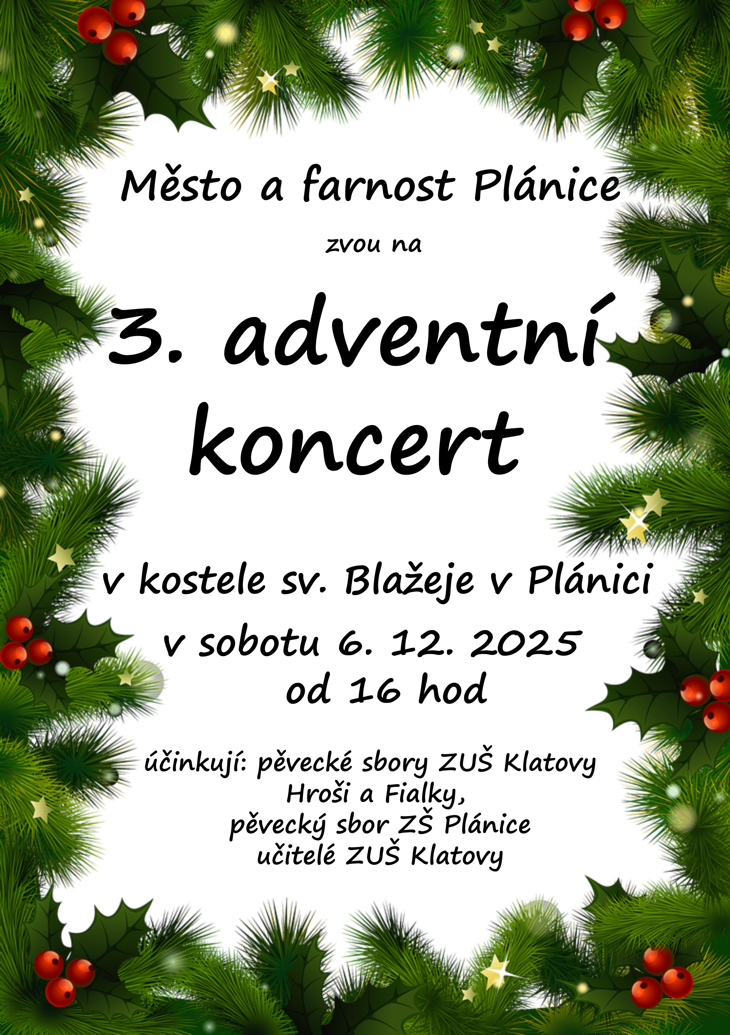 Zveme všechny na 3. adventní koncert v kostele sv. Blažeje v Plánici, a to v sobotu 6. prosince od 16hod.