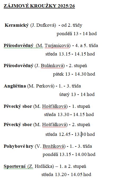 Dokumenty Naše škola je zapojena do projektu OP JAKNaše škola je zapojena do projektu Šablony IIIPravidla hodnocení žákůPřihláška na příměstský tábor 2026Školní řádŽádost o odklad povinné školní docházkyZpráva o činnosti školské radyVýroční zpráva za rok 2024/2025Kroužky na rok 2025 - 2026Naše škola je zapojena do projektu Doučování žáků školyNepřítomnost ve škole, uvolňování žáků z vyučováníOsvědčení o přínosu pro životní prostředí naší skoly za rok 2020Osvědčení o přínosu pro životní prostředí naší skoly za rok 2021Osvědčení o přínosu pro životní prostředí naší školy za rok 2022Příměstský tábor 2025Rozpočet příspěvkové organizace na rok 2021Rozpočet příspěvkové organizace na rok 2023 + střednědobý výhledRozpočet školy na rok 2022Rozpočet školy na rok 2024 a střednědobý výhled rozpočtuSeznam kandidátů do Školské rady, 2024Škola je pyšná na své žáky!Volební řád školské radyVýroční zpráva MŠ 2022/2023Výroční zpráva ZŠ 2022/2023Zaměstnanci školy přispěli na místní charitu - 2020Zaměstnanci školy přispěli na místní charitu - 2021